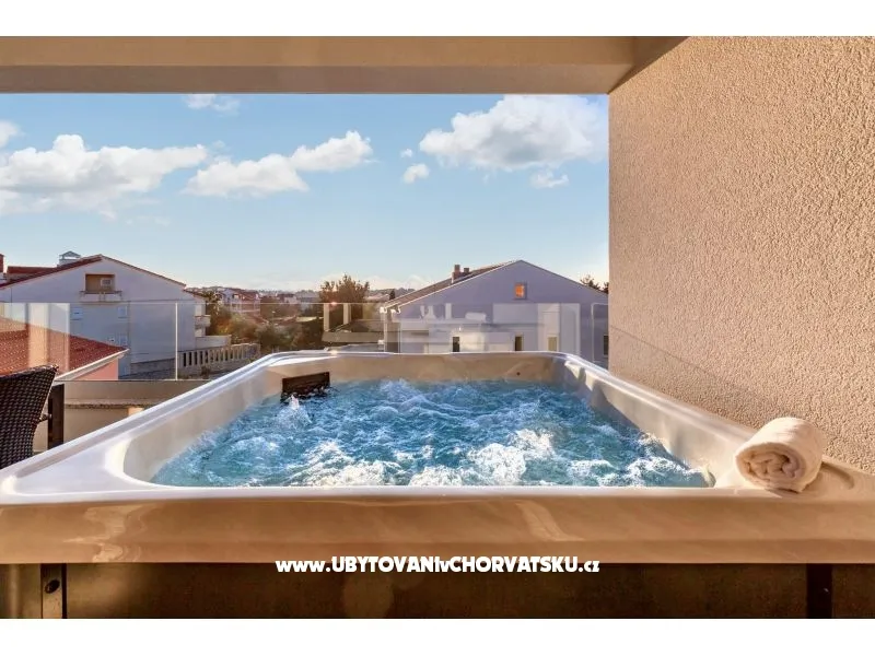 Das Apartment hat 2 Schlafzimmer mit Boxspringbetten und einen Wohnbereich mit einem Schlafsofa für 2 Personen. Es gibt auch einen Whirlpool für 6 Personen. Modern und luxuriös eingerichtet für insgesamt 6 Personen.