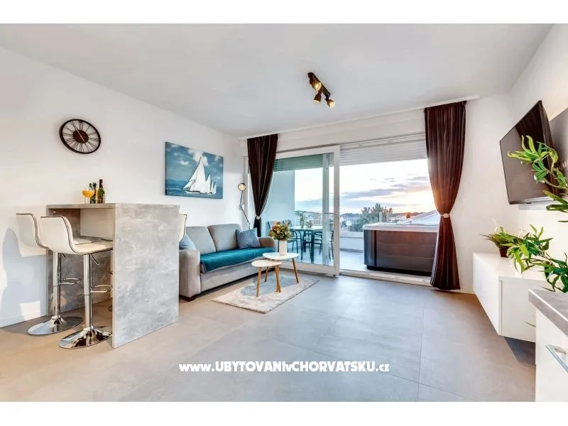 Das Apartment verfügt über 1 Schlafzimmer mit Boxspringbett, einen großzügigen Wohnbereich(mit einem Schlafsofa für 2 Personen) mit Küche und eine Terrasse mit Meerblick. Es ist hochwertig und modern eingerichtet. Adresse: Stanići 24, 53291 Novalja