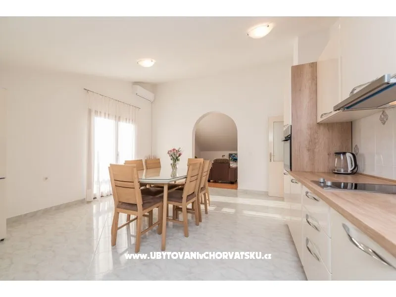 Das klimatisierte Apartment im zweiten Stock des Einfamilienhaus mit gemeinsamem Eingang.WIFI, 3 Schlafzimmer, eine voll ausgestattete Küche mit Geschirrspüler, Wohnzimmer mit zwei Betten, Bad, Gäste-WC, 3 Terrassen 2 davon mit Meerblick. Die Wohnung ist von einem großen Innenhof, ideal für Kinder umgeben, mit Garten und Gartendusche und einem großen Parkplatz.
